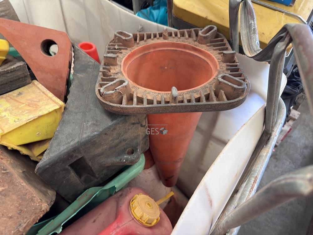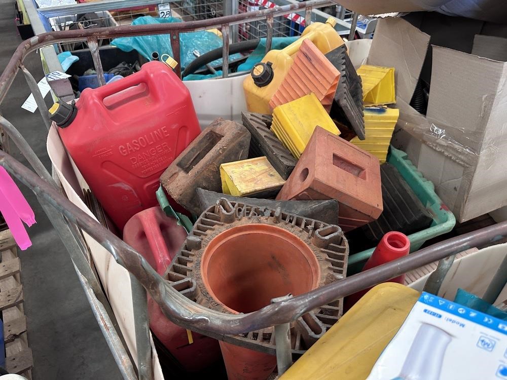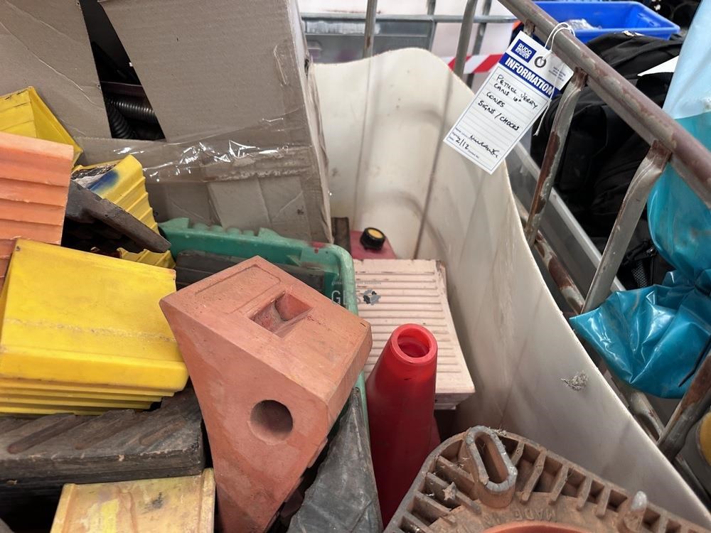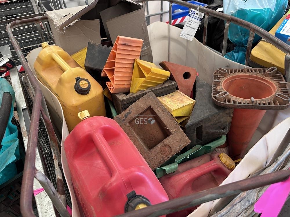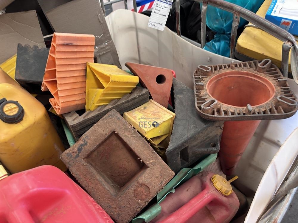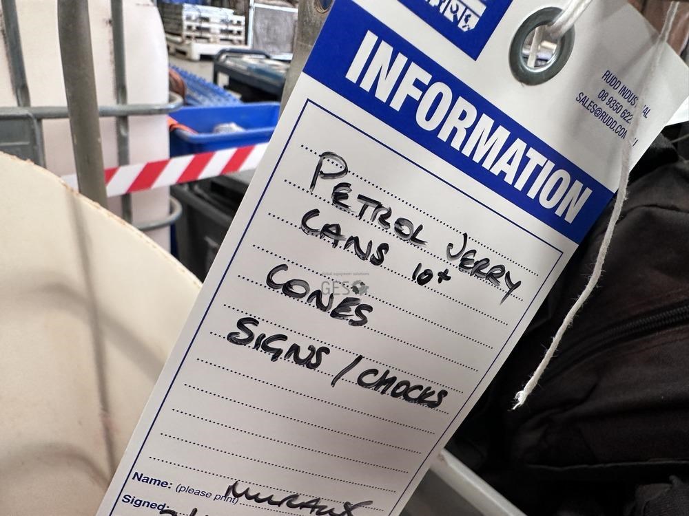Jerry cans x 10, signs, chocks & cones in IBC