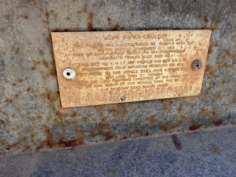 2011 John Papas 2 tonne 12 x 6 ft tandem axle box trailer. Registration can only be transfered to a Western Australia address. Offered for sale in "As Is Where Is" condition, the buyer is responsible for preparation and lifting on to buyers transport ex Midvale, WA.