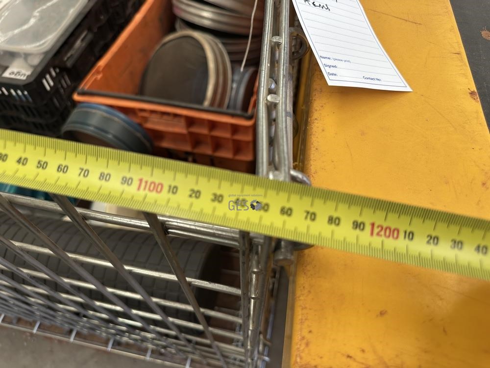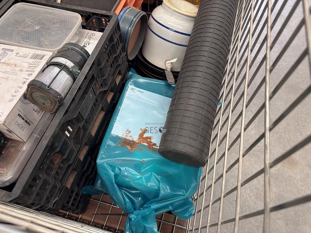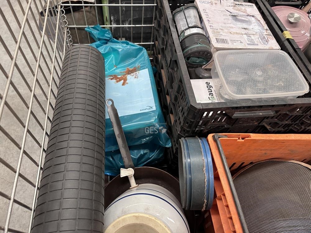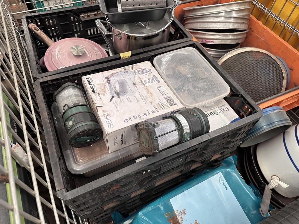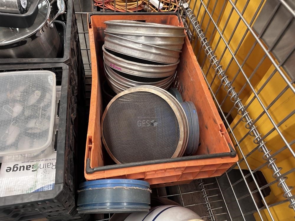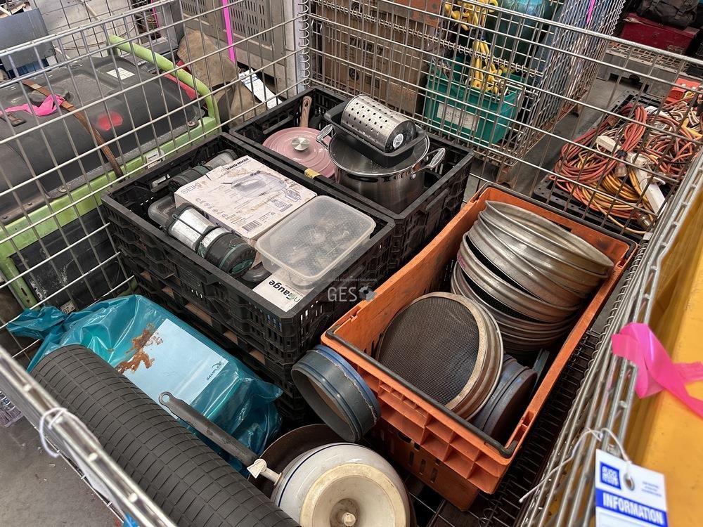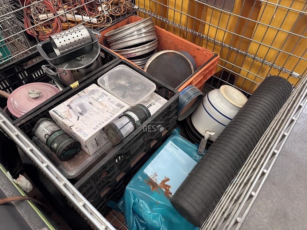 Kitchen camping items and exploration sieves in pallet cage