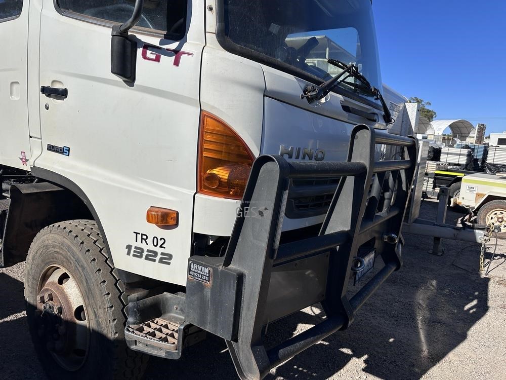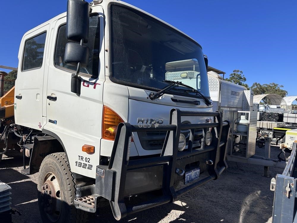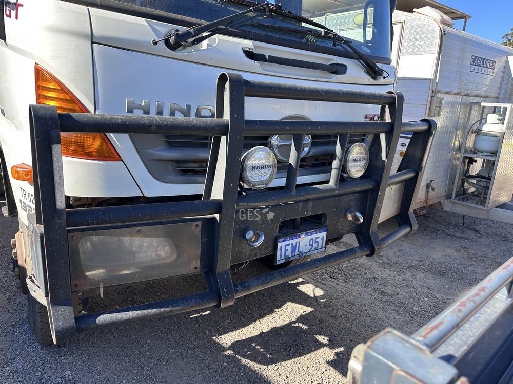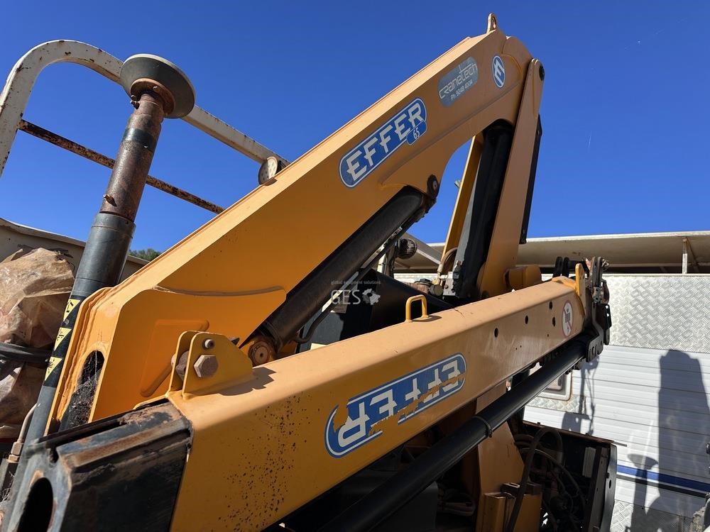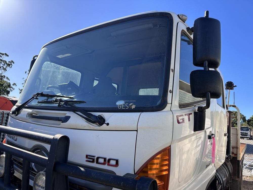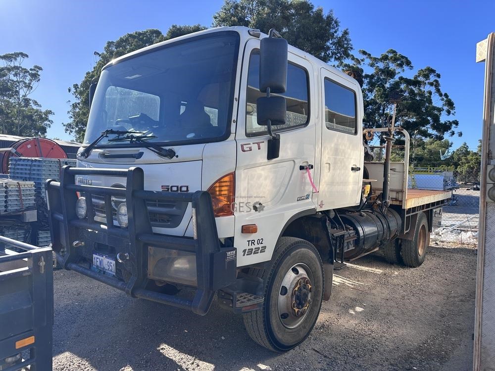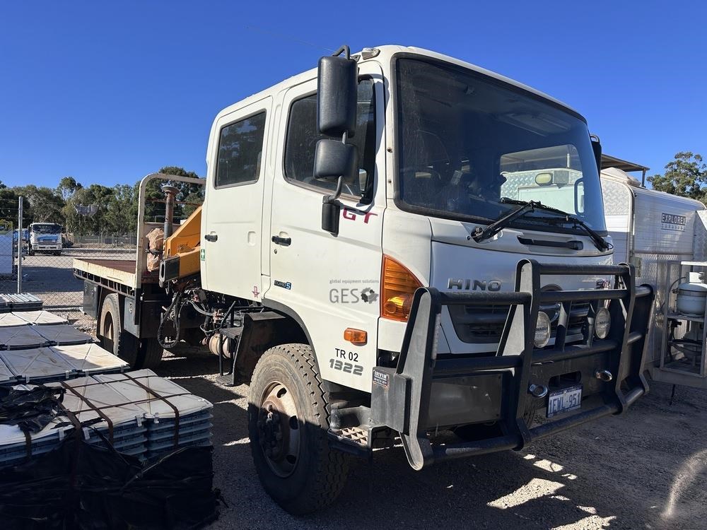 2014 Hino GT1JSER 2 500 1322 automatic Euro 5 dual cab 3.8 mtr single axle tray truck with Effer 65. Registration can only be transfered to a Western Australia address. Offered for sale in "As Is" condition, running to drive on to buyers transport ex Midvale, WA.