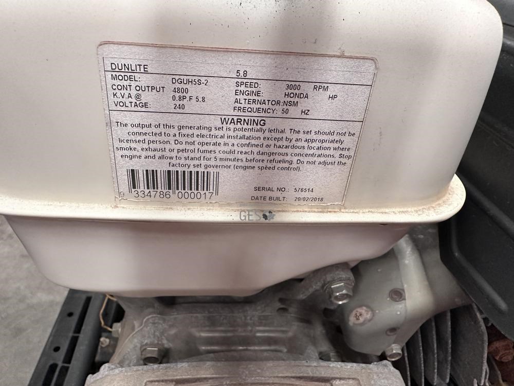 2018 Dunlite DGUH5S-2 5.8 KVA 240 volt generator outlets disconnected & untested