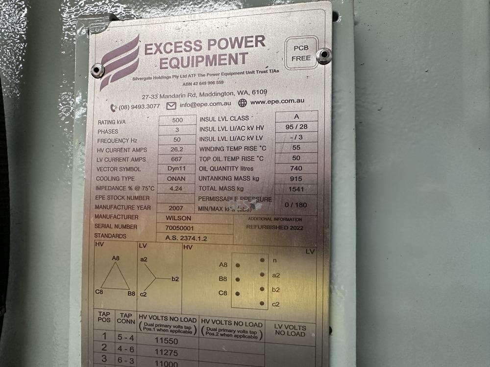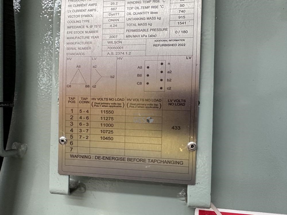 2007 Wilson 500 KVA 11 KV 433 Volt Dyn11 ONAN 4.24% CB/CB refurbished by EPE