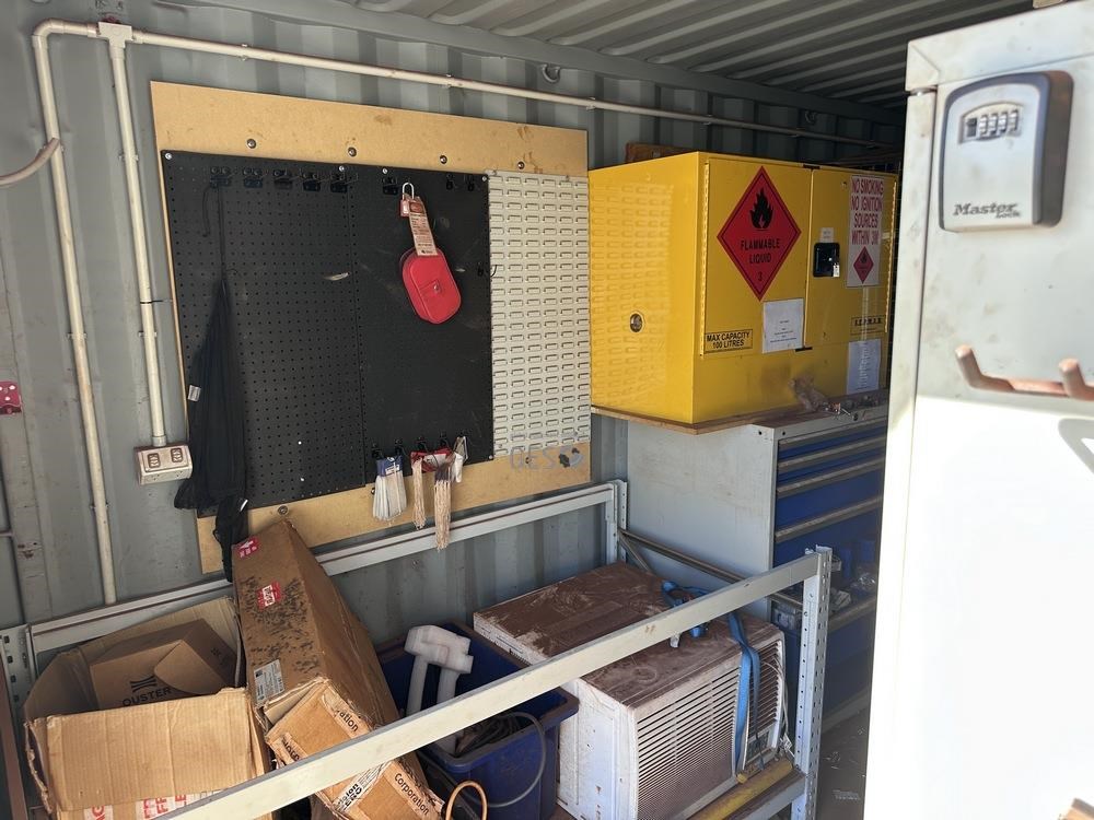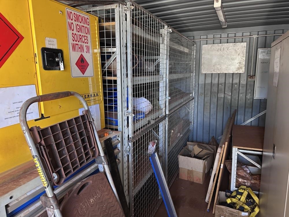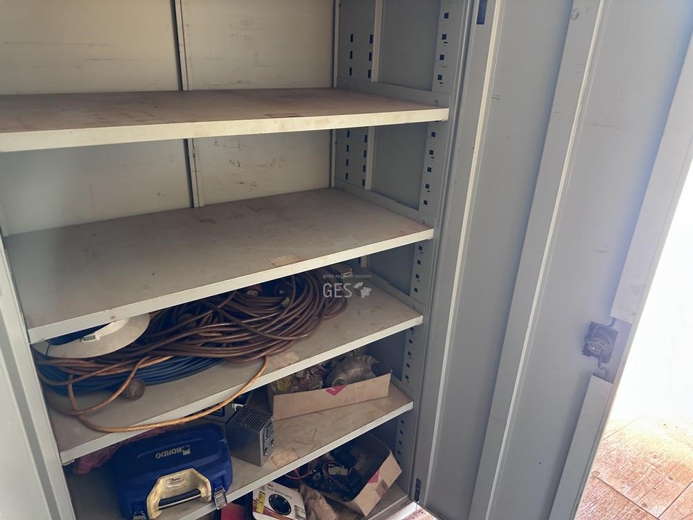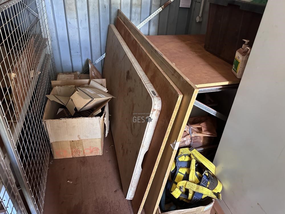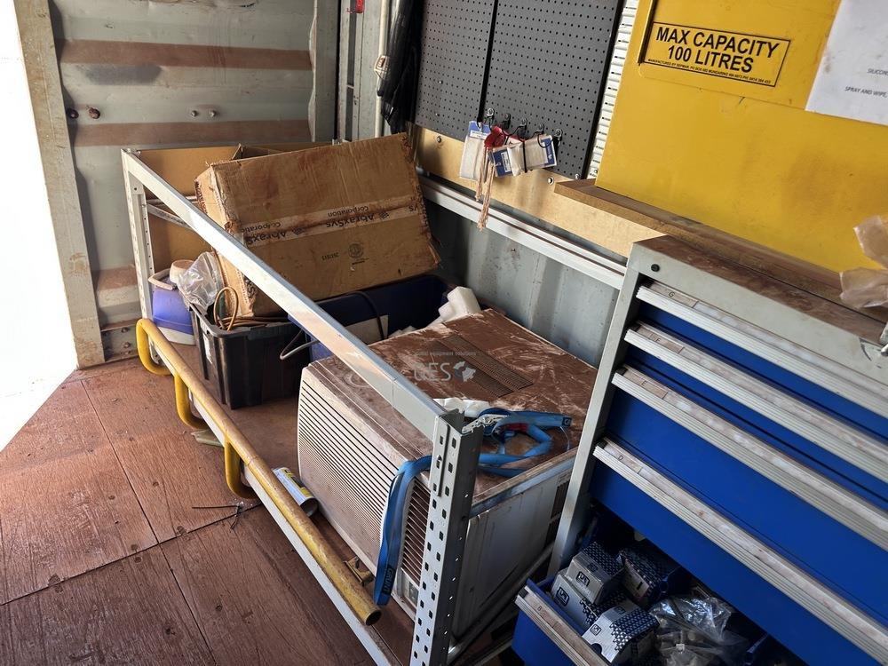 - Model 6 mtr Container C/w bench, drawers, caged shelving, cupboards & contents electrical fit out